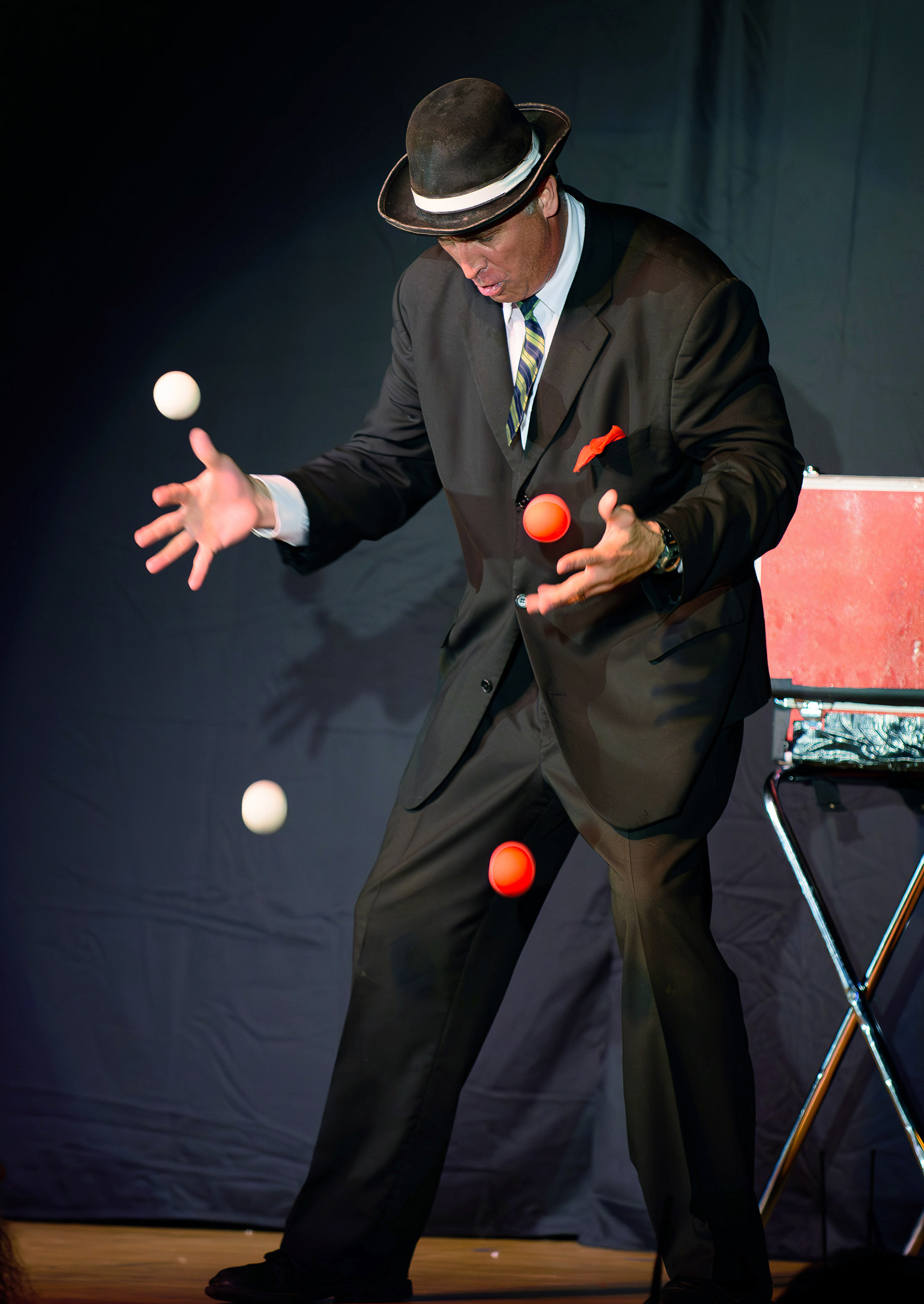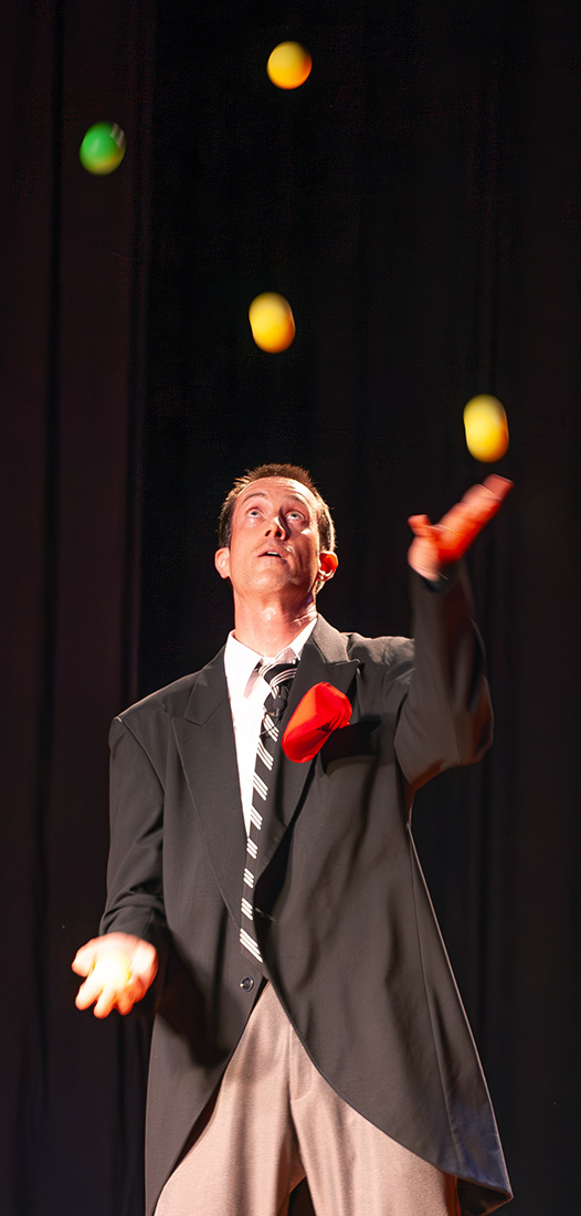 Comedy Juggler Jim Oakley (the tiny red thing is a peanut M&M)